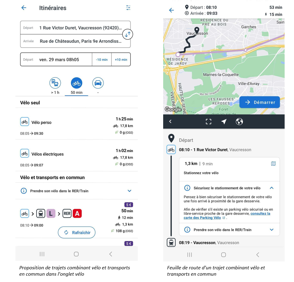 Cette évolution, disponible et effective sur votre application Île-de-France Mobilités, vous permet de consulter de nouveaux trajets combinant l’utilisation d’un vélo puis des transports en commun., Elle est disponible depuis l’onglet « vélo » de votre recherche d’itinéraire.